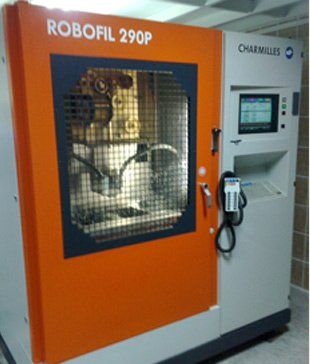También disponemos de una maquina de electroerosión (corte por hilo) la cual nos permite realizar formas no factibles en el mecanizado por arranque de viruta en cualquier tipo de material y durezas, mientras sea conductor de electricidad (materiales templados o tratados).